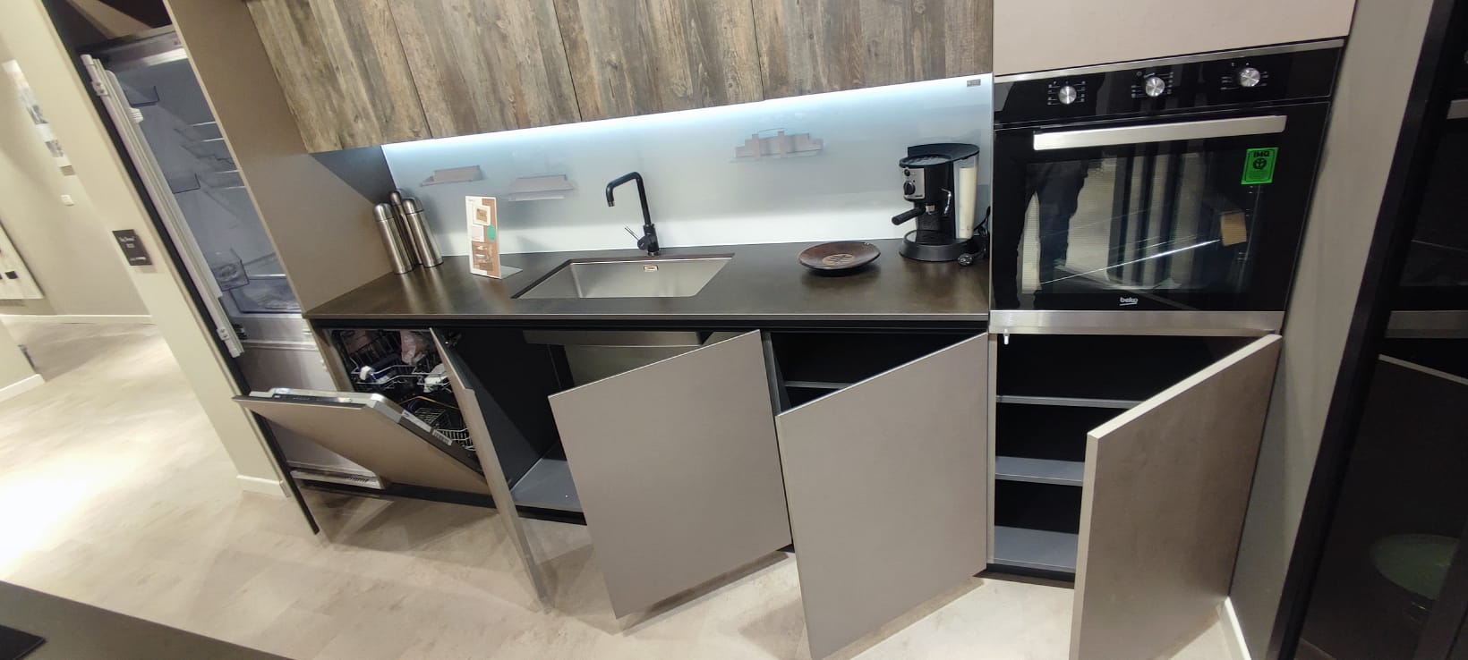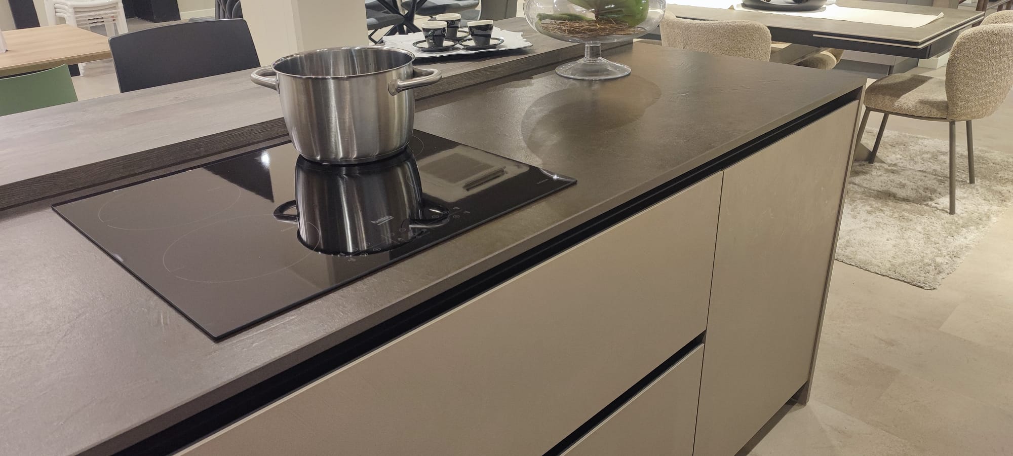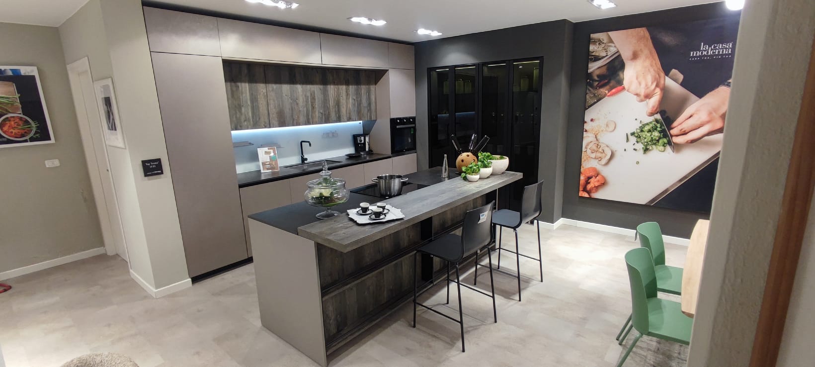 La base dell’isola si fa notare per i funzionali vani a giorno frontali, che donano dinamismo e leggerezza visiva all’intero blocco centrale.