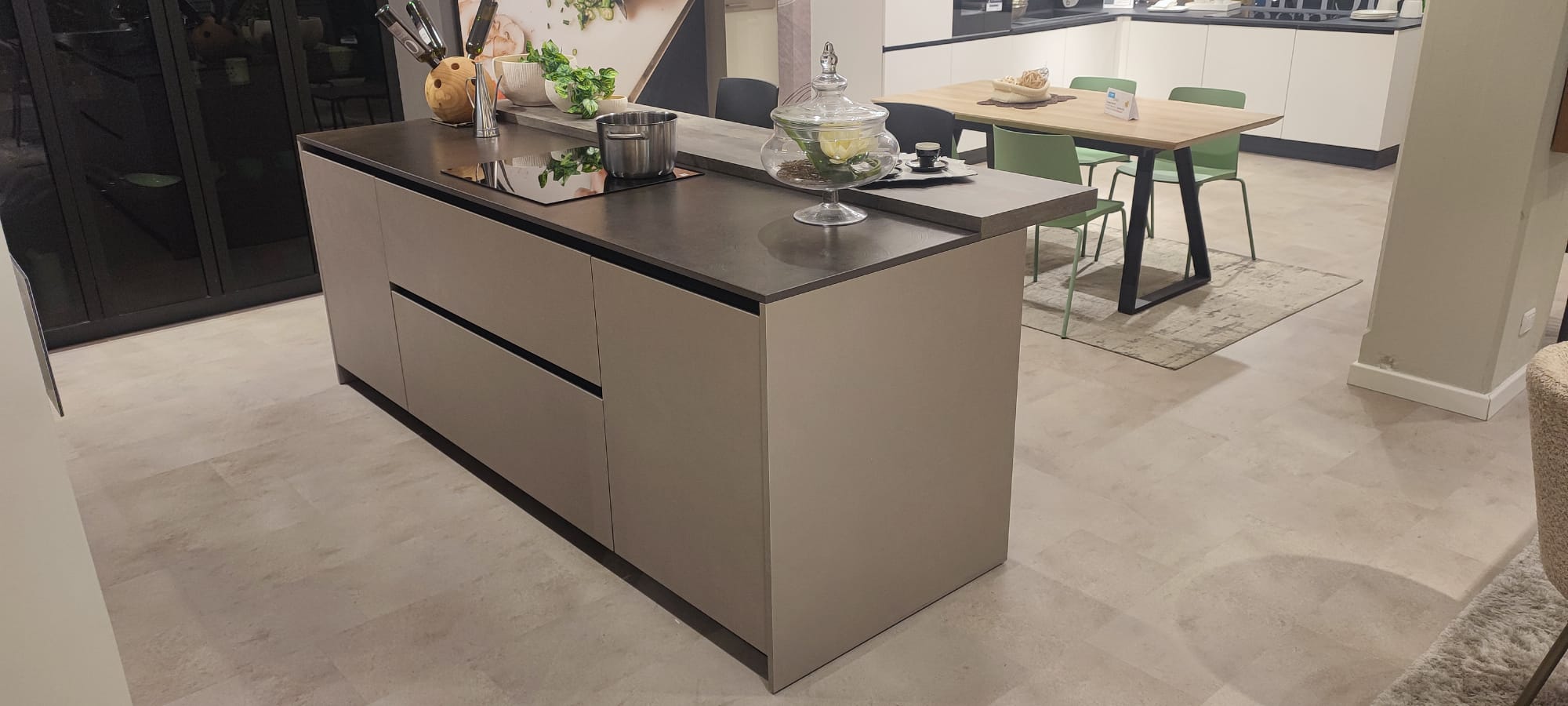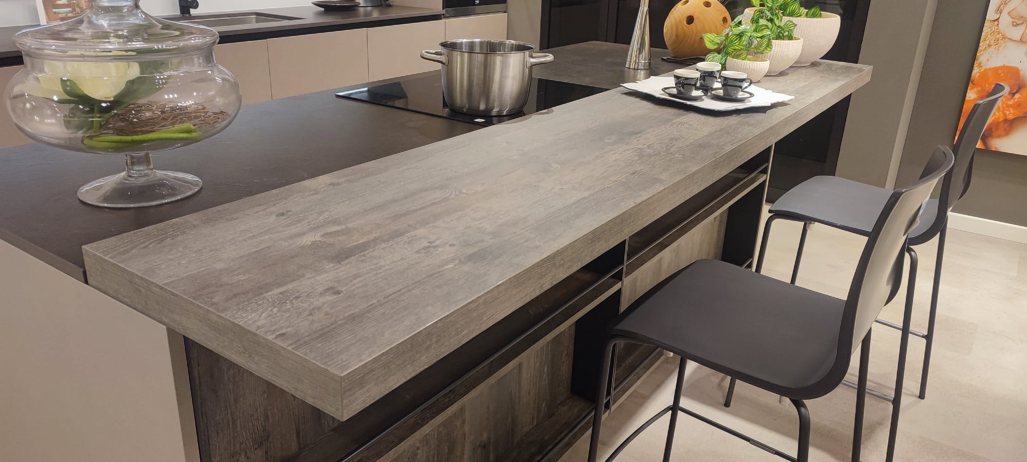 L’isola multifunzione domina lo spazio offrendo un ampio piano operativo, arricchito da un pratico bancone snack rialzato ad alto spessore.