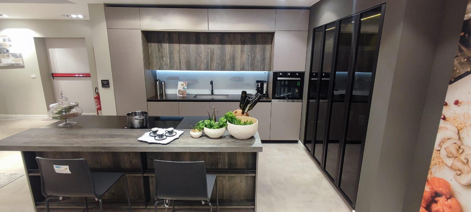 I pensili della zona a parete riprendono la finitura materica del bancone, creando una continuità stilistica capace di unire massima praticità ed eleganza. Arricchiscono ulteriormente il tutto lo schienale in vetro magnetico e il piano in ceramica